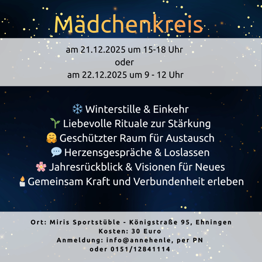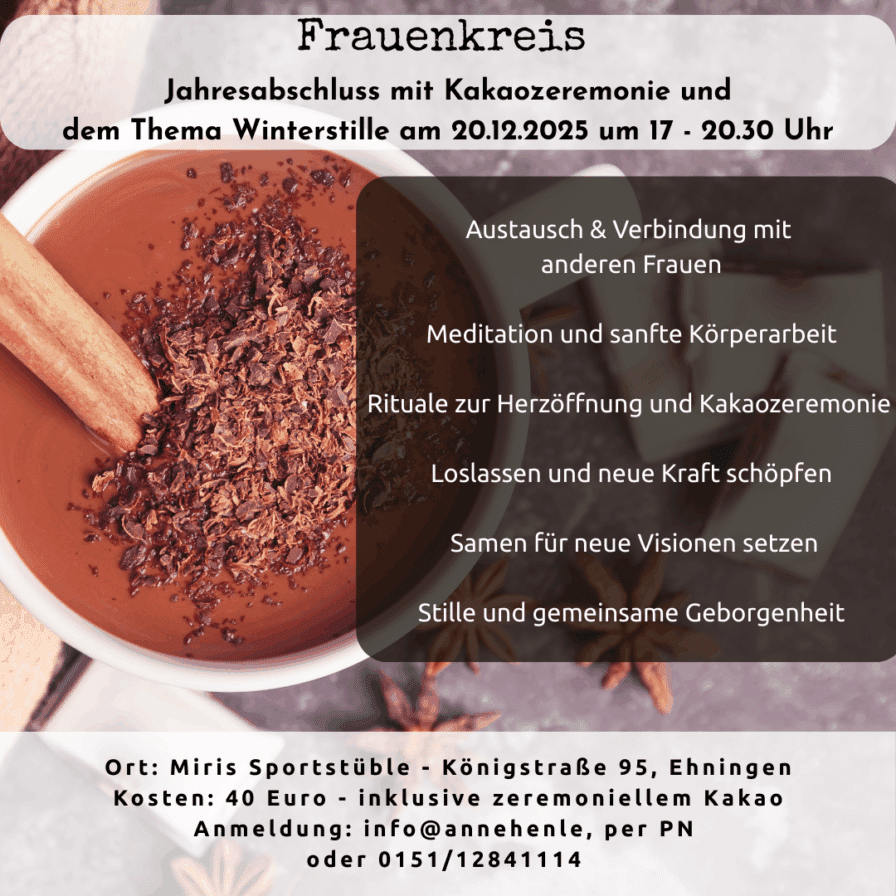 In unserem Kreis gibt es viel Raum für Herzensgespräche, schöne gemeinsame Momente und die Möglichkeit, das vergangene Jahr loszulassen. Zusammen überlegen wir, welche Wünsche und Träume wir im neuen Jahr wachsen lassen wollen 🌸🌱.